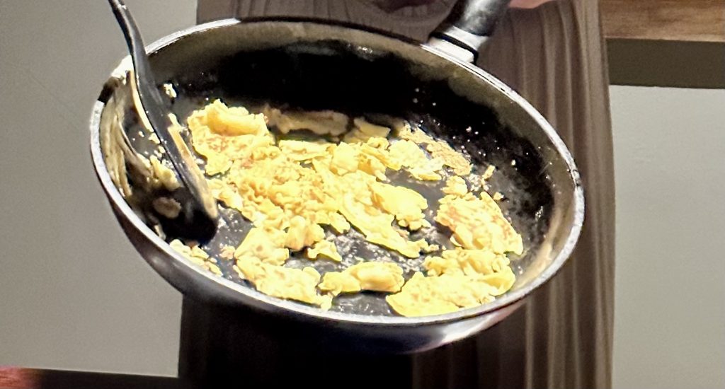 A third trip to the supermarket for one meal feels a tad overzealous – so instead we improvise and use vegetable oil. The result is interesting… In place of a pancake we find ourselves with what we affectionately refer to as pancake bites. They look horrendous – but are in fact quite tasty (honest)!