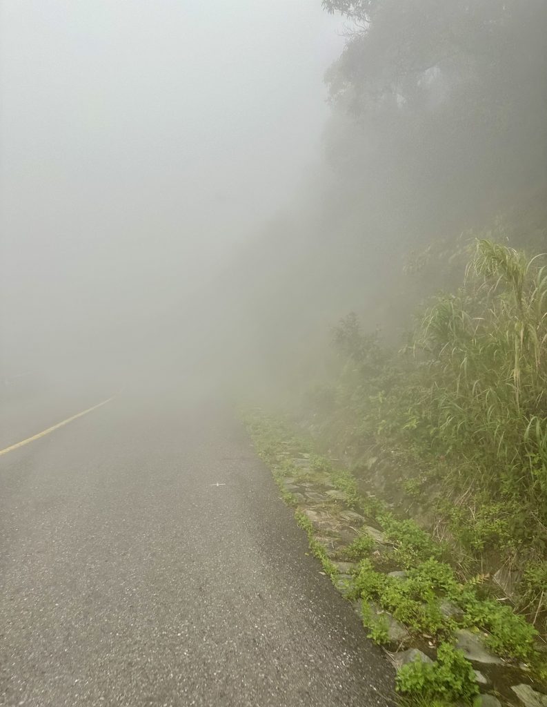 Wouldn’t you know it? Just as the road starts to climb, thick fog descends. It gradually worsens to the point that it’s difficult to see more than a few feet in front. Bugger!