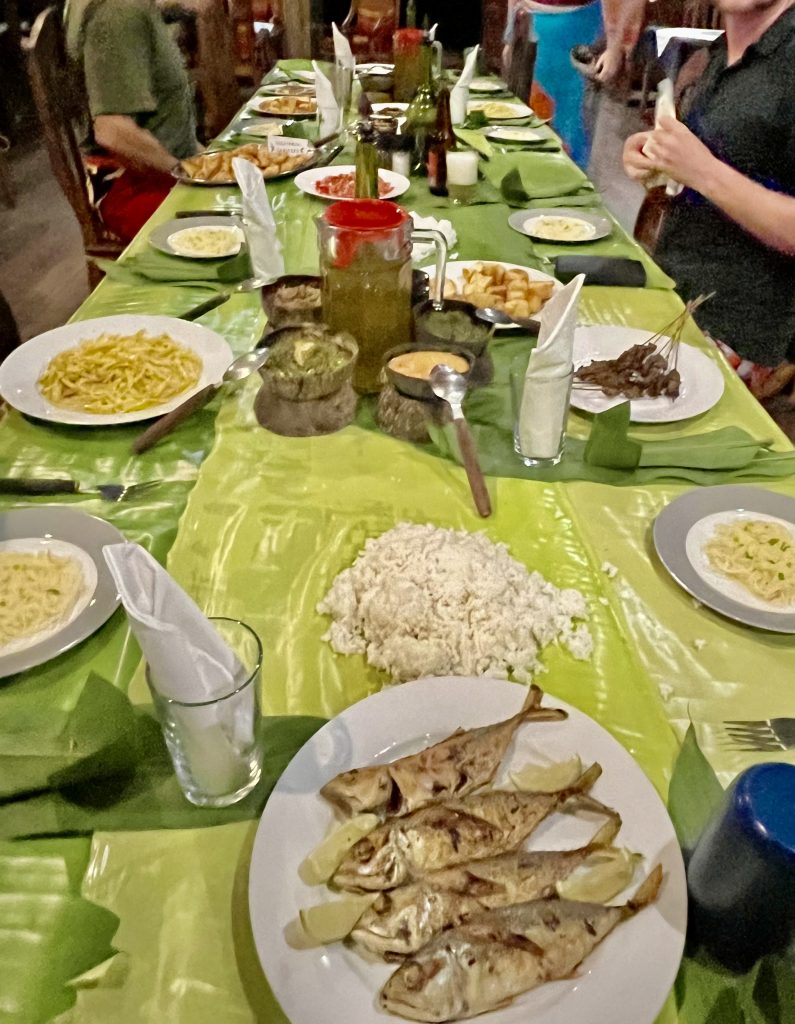 On Friday nights the staff join guests for a traditional dinner. The table cloth and spoons are made from local leaves – and in place of plates we eat directly off the leaves. We’d been shown how to make said spoons by our guide that afternoon. Makes cleaning up easy, once we’re done, everything is rolled up and thrown away. 100% recyclable.