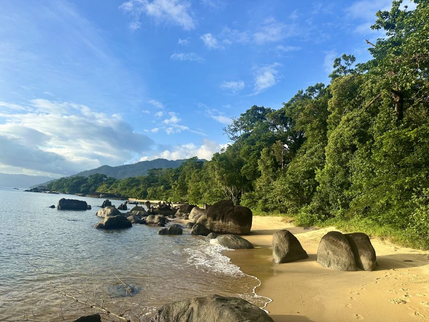 The sea is rough, the rain sets in, and one is very definitely reminded of the reason that this is known as a humid rainforest. The lodge is designed to reflect an African safari, with raised tents and outdoor bathrooms. As with other humid forests we’ve visited, everything is damp. Given that the forecast is rain, that it has been raining for two weeks, and that there is a brief lull in proceedings, I decide to go snorkelling. See an adult lion fish, which is a pretty impressive size.