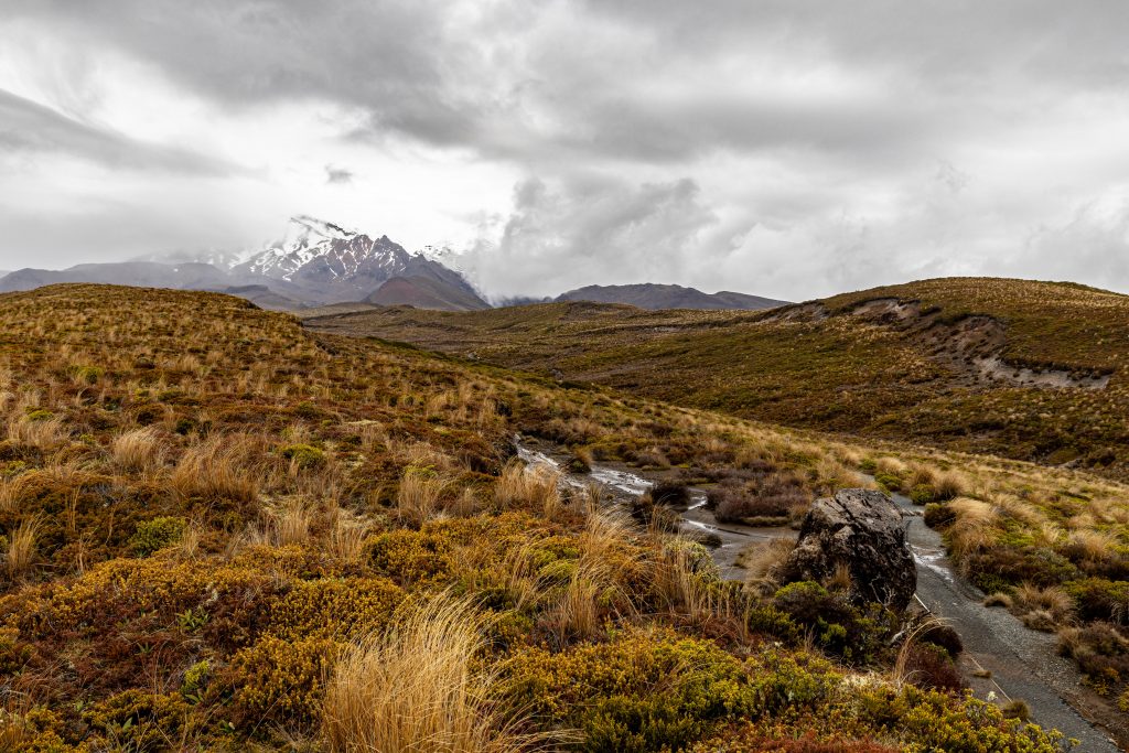 We decide instead to do the nearly 20km hike to the Upper and Lower Tama Lakes via the Taranaki Falls. It’s dry as we head out and we are provided tantalising glimpses of what the scenery might be like on a clear day. As it is, the landscape is still pretty stunning.