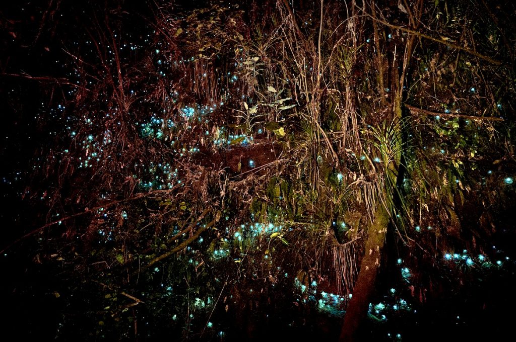 When we get home, there’s no rest for the wicked. We have time for a cup of tea and a bite to eat before heading back out for an evening tour. Glow worm tours are popular in this area, although most take place in caves. We’ve opted for a night-time trek in a native forest. It’s pissing it down with rain as we head off. Can’t help wondering if the glow worms will have more sense than us, and stay indoors!