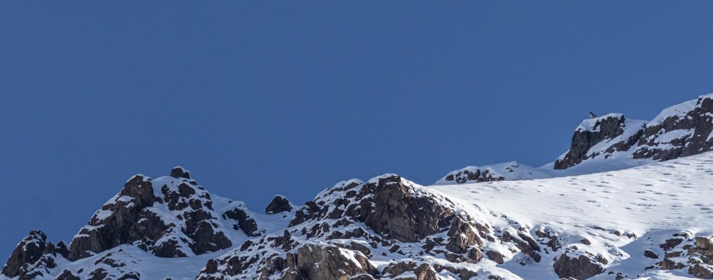 All at once everything kicks-off. I see a dot emerge from the rocks, the ibex scarper, and a chase down the mountainside. It’s over in seconds. Leopards are explosive, ambush hunters, if they miss with the first attempt it is almost impossible for them to bring down a full-grown ibex. The snow is crazy deep as well, almost entirely obscuring the leopard.