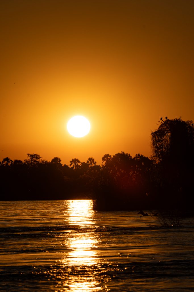 We see some very decent sized crocodiles and a myriad of hippos. In the distance we can see the mist rising from Victoria Falls. We are also treated to a final spectacular African sunset.