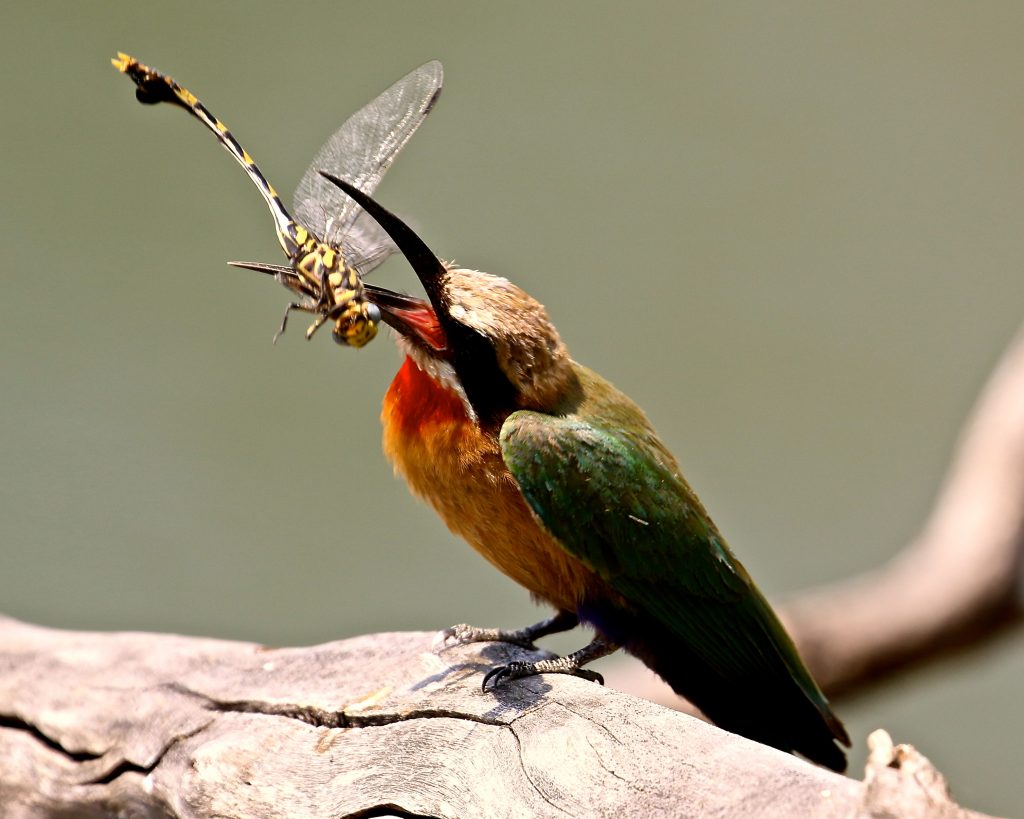 White-fronted Bee-eater. Bee-eaters are named for their unique diet consisting largely of bees and other flying insects, which they catch in mid-air using their long, sharp bills. Some bee-eater species have even evolved special adaptations to protect themselves from the stings of their prey.